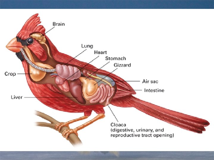 Metabolism • Birds have a system of branching air sacs that function with their lungs in respiration. • The system of air sacs supplies the high levels of oxygen needed to support a high rate of metabolism for the hard-working flight muscles. • This high metabolic activity also provides heat for endothermy.