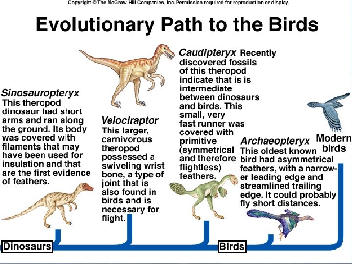 Archaeopteryx • Represents an animal that lived about 150 million years ago. • Unlike modern birds, Archaeopteryx had clawed forelimbs, teeth, and a long tail with vertebrae—all reptilian characteristics. • In fact, if the feathers had not been preserved in the fossil, Archaeopteryx probably would have been identified as a small dinosaur.