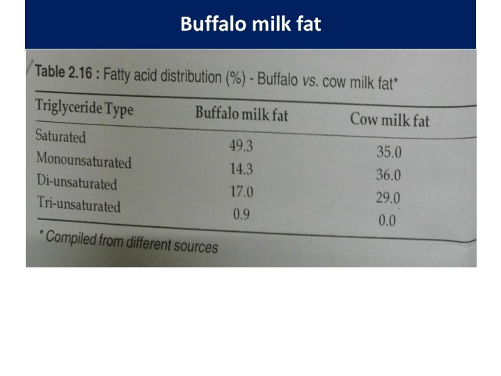Buffalo milk fat • Buffalo milk -- richer than cow milk in fat content, which contribute to its unique taste. • Fat globules are larger than those in cow milk. • Average cholesterol content of buffalo milk is 20 mg/100 ml which is significantly higher than that of cow milk. • Buffalo milk has higher proportions of butyric, stearic and palmitic acids and lower levels of caproic, caprylic, myristic and linoleic acids. • Contains higher levels of makeup. tetraenoic and pentaenoic acids in its fat • Total level PUFA and free fatty acids (FFA) are lower than that in cow milk.