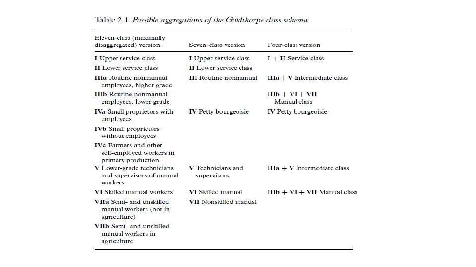 Goldthorpe (2000)-Class Schema • Positions classified according to 1) relationship to the means of production and 2) kind of employment relationship • 4 dimensions: asset specificity, monitoring difficulty, labor contracts, service relationships • Asset specificity: is the job high-skilled, low-skilled, require training? • Monitoring difficulty: when its hard to tell if employee is acting in the employer’s interests • Labor contracts: physical labor, perhaps blue-collar • Service relationships: less physical, perhaps white-collar
