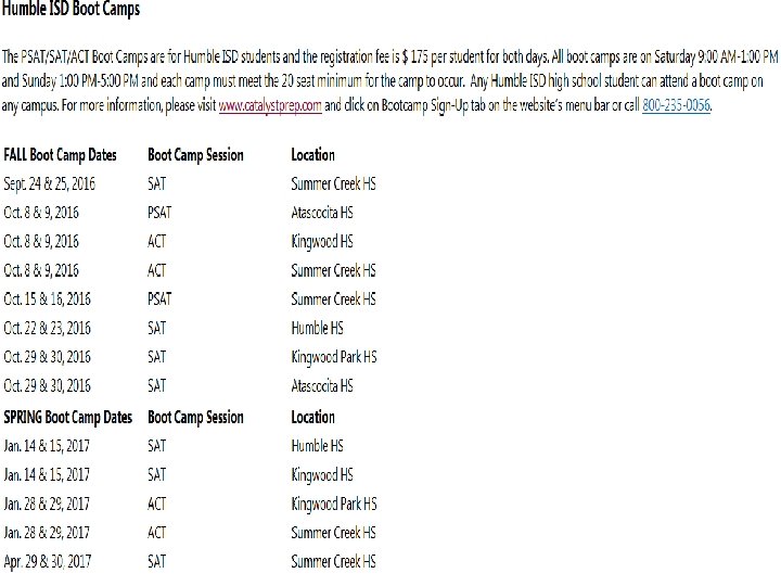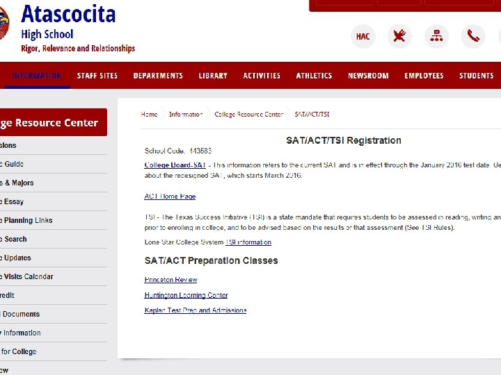 SAT and ACT * Register online (SAT - College Board Online www. collegeboard. org or ACT online www. act. org. * The Atascocita High School College Board Campus code is 443583. * The TSI Assessment College placement test is a placement test for college courses. * Students may be exempt from taking the TSI based on SAT or ACT scores. * Students must consult with each college to verify the criteria for being exempt.