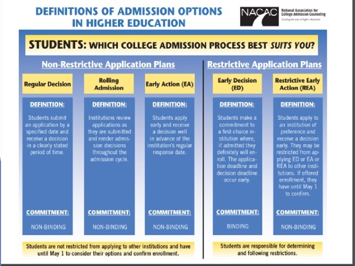 How Do Colleges Choose Who Will Be Accepted? Holistic Admission Process: Primary Factors Academic Rigor Grade Trends/Academic Performance Testing (ACT, SAT, AP Exams, IB Exams, SAT Subject Tests) Additional Factors Extracurricular Activities Essay(s) Letters of Recommendation Demonstrated Interested Optional Factors: Interviews Arts Portfolio and/or Audition Athletic Recruitment (Only NCAA Division I and II, NAIA, NJCAA offer athletic scholarships)