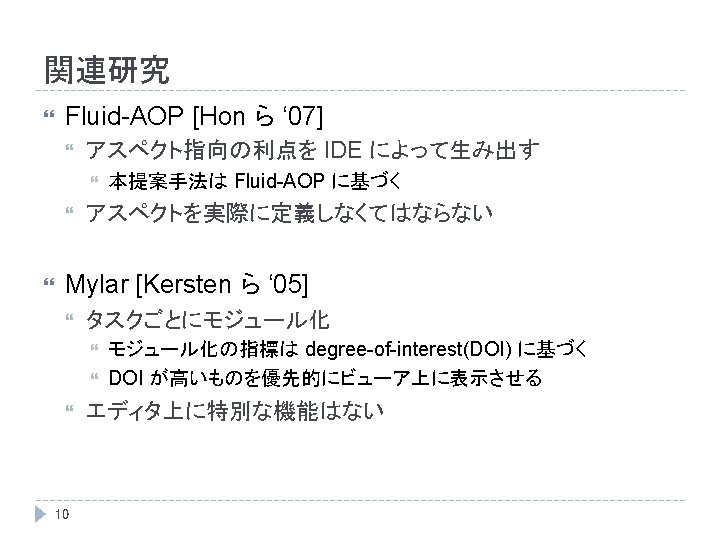 提案:関心事ごとに視点を切り替えられる IDE 複数ファイルにまたがる編集を一つのウィンドウで行える 関心事をエディタ上に抽出 抽出元のファイルに編集結果を反映 class Polygon ex. Shape { … set. XPoint(int x){ void this. xpoint = x; Screen. repaint(); } class Rectangle ex. Shape { … } 4 … set. Width(double w){ void this. width = w; Screen. repaint(); } class Circle ex. Shape { … … } set. Radius(double r){ void this. radius = r; Screen. repaint(); } … } Repainter /* FROM Rectangle */ void set. Width(double w){ … Screen. repaint(); Editor } /* FROM Circle */ void set. Radius(double r){ … Screen. repaint(); }