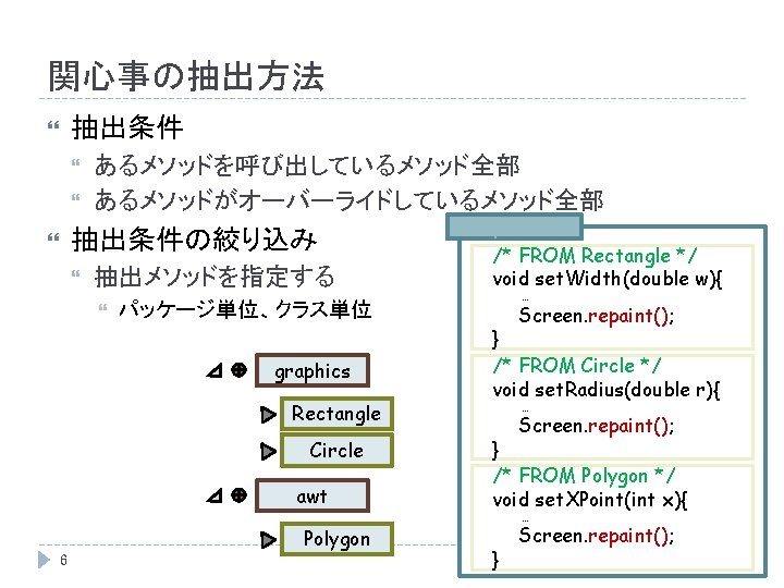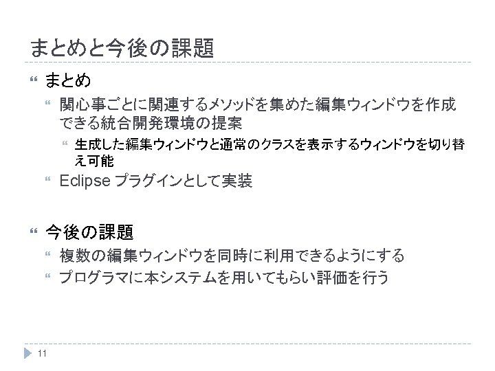 約3000行 Eclipseプラグインとして実装 抽出元ファイルとの同期 ドキュメントリスナを用い、編集を感知 キー入力のoffsetを利用し編集対象を特定 IDocumentのreplaceメソッドを用いる 編集があった! Listener set. Width @Rectangle j: 167 -218 n: 2 -53 set. Radius @Circle … 8 repaint() の代わりに update() にしたい… Repainter File class Rectangle { void set. Width(…){ … event. offset is 48 … void set. Width(…){ … Screen. repaint(); … repaint() update() Screen. repaint(); Screen. update(); } } … void set. Radius(…){ } … Screen. repaint(); File } class Circle { … }
