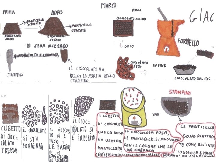 … mentre mescolavo il cioccolato vedevo ogni volta il cubetto che si abbassava sempre di più e il cioccolato fuso si alzava, secondo me perché le particelle si staccavano con il calore della candela e della tazza e il cioccolato si stava fondendo. Quando ho messo nello stampino il cioccolato sentivo caldo, ma dopo un po’ l’ho sentito più freddo … era successo che le particelle si stavano di nuovo unendo, così formavano la solidificazione … Ci siamo accorti che la tazzina si era rotta con il calore, perché le “cellule” si sono staccate. Le particelle mentre fondevano si muovevano troppo e avevano bisogno di spazio e quindi il cioccolato mi sono accorto che stava scendendo e quindi si è allargato … (Giacomo)