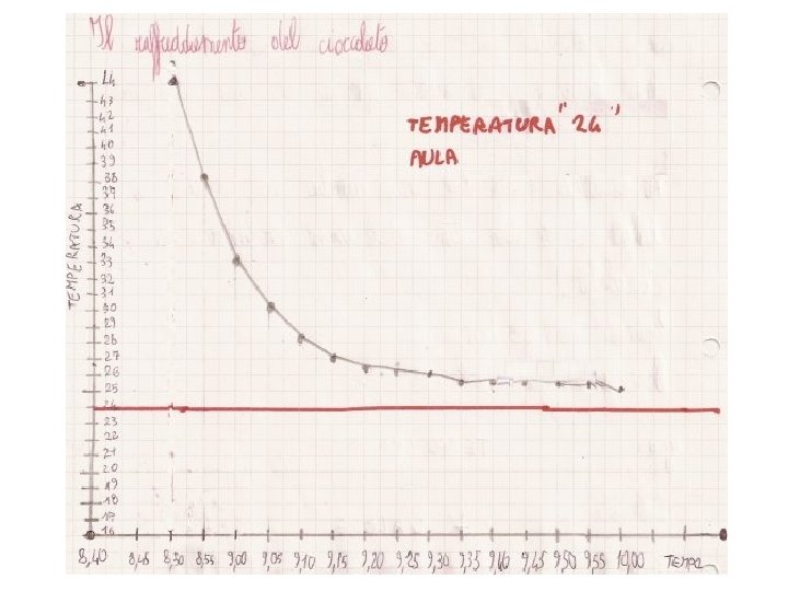 Che cosa ci dice la linea? Dalla conversazione… Giov: Questo grafico ha una verticale che rappresenta i gradi e una riga in orizzontale che rappresenta il tempo che passa. Siamo partiti da 44° e dopo piano, siamo scesi fino ad arrivare a 25. Con il righello abbiamo fatto una riga rossa perché volevamo vedere se scendevano giù, sotto i 24 gradi dell’aula. Gioz: verso le 8. 40 siamo partiti con una temperatura molto alta e con il passare del tempo la temperatura calava. E’ come che il tempo passava e il calore diminuiva nella cioccolata, il calore lo dava all’aria che si riscaldava un po’. Ilaz: la linea mi dà informazioni che il cioccolato quando prima era a 44°, mano che era all’aria, i gradi diminuivano sempre di più fino ad arrivare a 25, le particelle me le immagino che certe sono rimaste nel cioccolato e certe sono andate nell’aria per far sentire l’odore. Sab. Abbiamo prima visto la temperatura dell’aria e l’abbiamo segnata con il pennarello rosso. La temperatura secondo me sarebbe i gradi di livello dell’aria dell’aula oppure di qualsiasi cosa. Io mi immagino che dentro le particelle, se metti il termometro dentro una cosa calda, il termometro ti dice quanto si stanno muovendo le particelle. Secondo me la linea curva mi dice quanto si stanno muovendo le particelle.