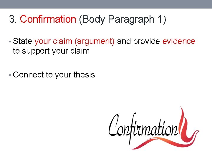 3. Confirmation (Body Paragraph 1) • State your claim (argument) and provide evidence to support your claim • Connect to your thesis.
