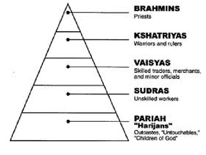 Untouchables • Outside the Caste system (outcasts!) • Untouchables did the worst jobs, like cleaning up people's poop from the gutters, handling dead bodies or collecting garbage.