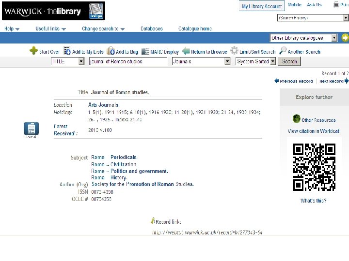 Google Scholar • Better quality research information than Google • Scholar preferences ØClick on Library Links and enter “Warwick” to get access to all our full text journal subscriptions ØClick on Settings and then on Bibliography Manager to import references into End. Note or other reference management packages • Scholar Advanced Search