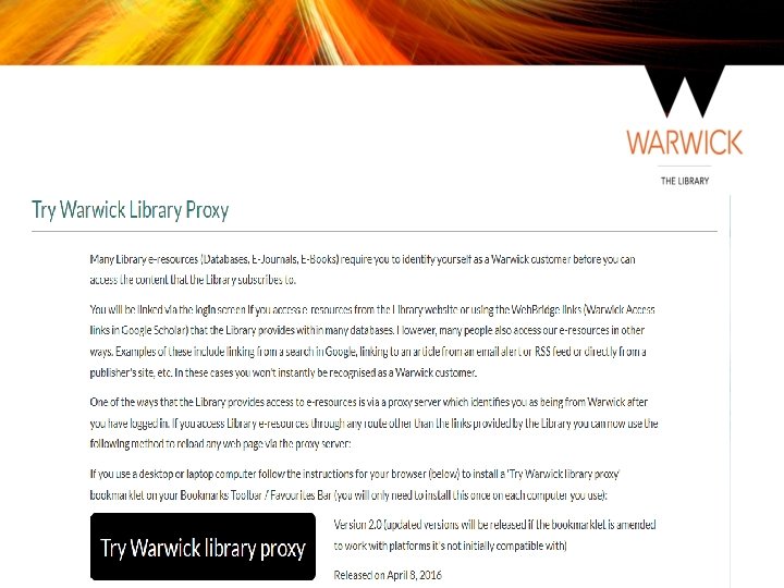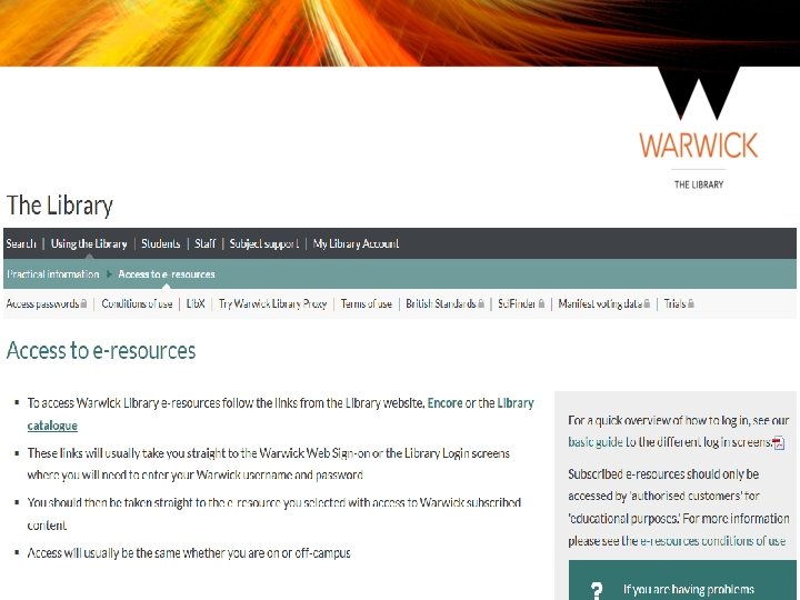 Get. WISE and Study blog • Get. WISE is a Moodle course, designed to cover finding information beyond the basics, including advice on developing your research skills, referencing and avoiding plagiarism • The Study Blog offers tips and advice to enhance your study experience at Warwick http: //studyblog. warwick. ac. uk/