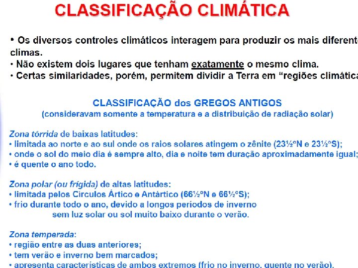 Climas • Fatores ou controles climáticos: determinam o clima de uma região • Elementos climáticos: observações/medidas de temperatura, umidade, vento, precipitação, etc.
