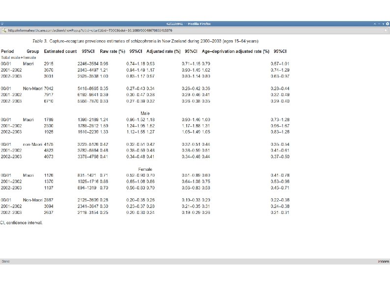References. Cheng F, Kirkbride JB, Lennox BR, et al. Administrative incidence of psychosis assessed in an early intervention service in England: first epidemiological evidence from a diverse, rural and urban setting. Psychol Med. 2010 Dec 23: 1 -10. [Epub ahead of print] Fleishaker et al. Comorbid Somatic Illnesses in Patients with Severe Mental Disorders: Clinical, Policy and Research Challenges. Journal of Clinical Psychiatry 2008; 69: 514 – 519. Foley DL, Morley KI. Systematic Review of Early Cardiometabolic Outcomes of the First Treated Episode of Psychosis. Arch Gen Psychiatry. 2011 Feb 7. [Epub ahead of print Kake TR, Arnold R, Ellis P. Estimating the prevalence of schizophrenia among New Zealand Maori: a capture-recapture approach. Aust N Z J Psychiatry. 2008 Nov; 42(11): 941 -9 Carpenter WT, Bustillo JR, Thaker GK, van Os J, Krueger RF, Green MJ. The psychoses: cluster 3 of the proposed meta-structure for DSM-V and ICD-11. Psychol Med. 2009 Dec; 39(12): 2025 -42. ] Kelly BD, O'Callaghan E, Waddington JL, Feeney L, Browne S, Scully PJ, Clarke M, Quinn JF, Mc. Tigue O, Morgan MG, Kinsella A, Larkin C. Schizophrenia and thecity: A review of literature and prospective study of psychosis and urbanicity in. Ireland. Schizophr Res. 2010 Jan; 116(1): 75 -89 Bottlendera, R Strauß A Möller H Social disability in schizophrenic, schizoaffective and affective disorders 15 years after first admission. Schizophrenia Research Volume 116, Issue 1, January 2010, Pages 9– 16 Sasha S, Chant D, Mc. Grath J. A systematic review of mortality in schizophrenia: is the differential mortality gap worsening over time? Arch Gen Psychiatry. 2007 Oct; 64(10): 1123 -31.