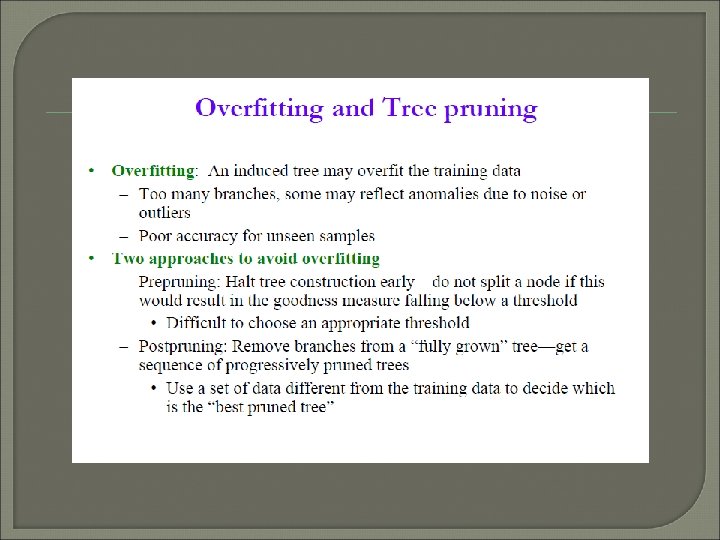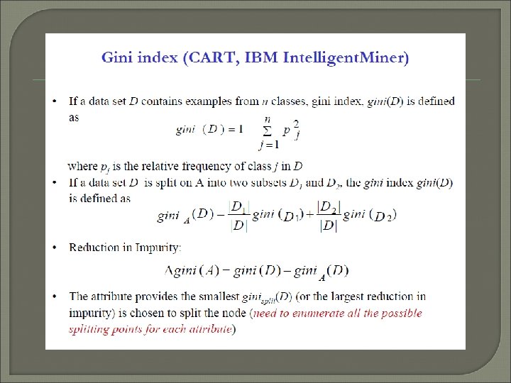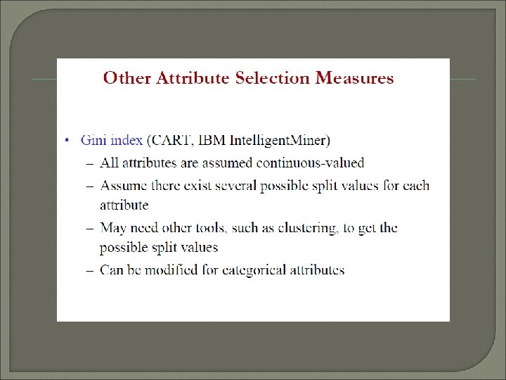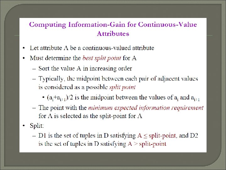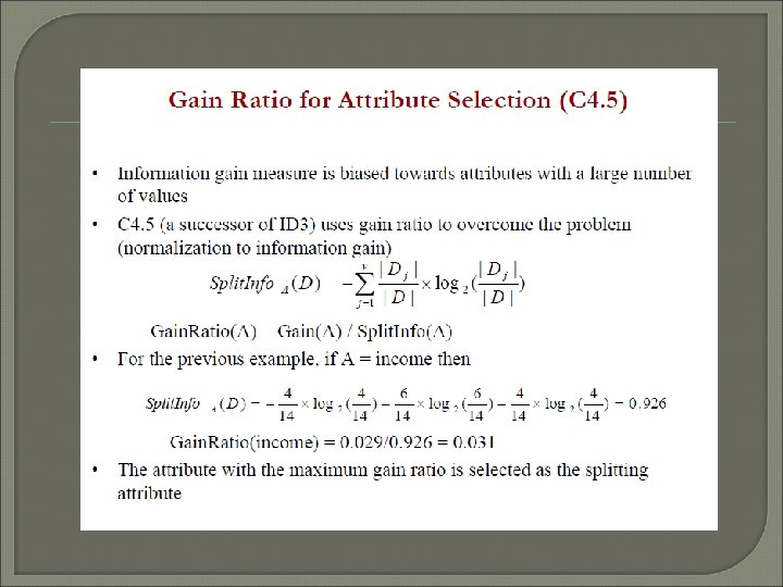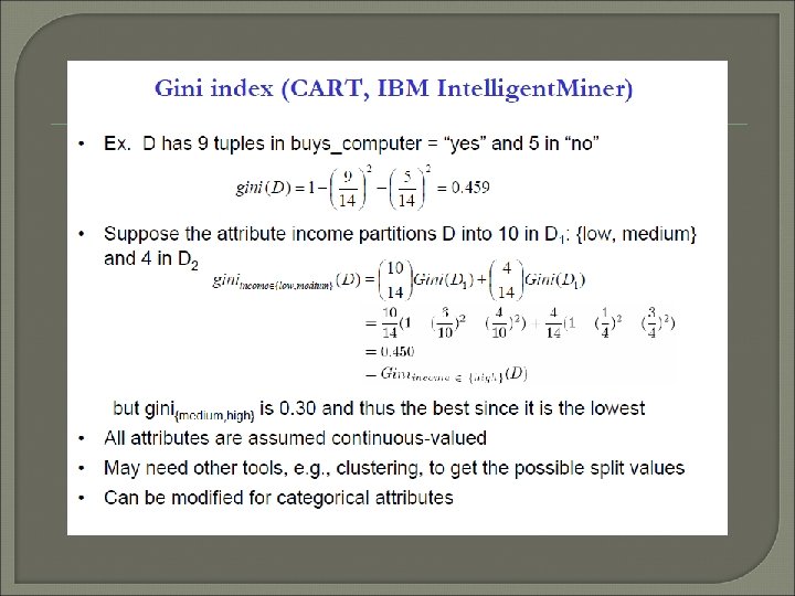 Contd… �The expected information needed to classify a tuple in D if the tuples are partitioned according to age is �Hence, the gain in information from such a partitioning would be
