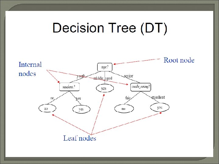 Classification by Decision Tree Induction �A decision tree is a flowchart-like tree structure, where each internal node (nonleaf node) denotes a test on an attribute, each branch represents an outcome of the test, and each leaf node (or terminal node) holds a class label. �The topmost node in a tree is the root node.