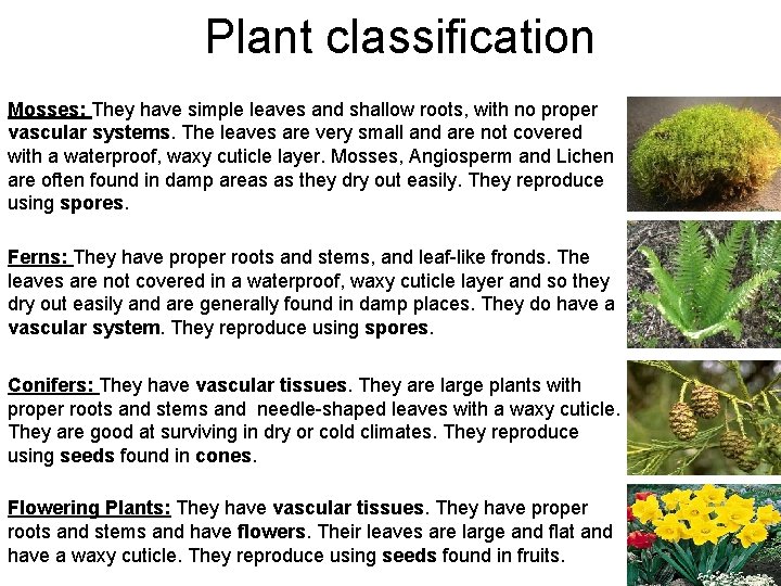 Plant classification Mosses: They have simple leaves and shallow roots, with no proper vascular systems. The leaves are very small and are not covered with a waterproof, waxy cuticle layer. Mosses, Angiosperm and Lichen are often found in damp areas as they dry out easily. They reproduce using spores. Ferns: They have proper roots and stems, and leaf-like fronds. The leaves are not covered in a waterproof, waxy cuticle layer and so they dry out easily and are generally found in damp places. They do have a vascular system. They reproduce using spores. Conifers: They have vascular tissues. They are large plants with proper roots and stems and needle-shaped leaves with a waxy cuticle. They are good at surviving in dry or cold climates. They reproduce using seeds found in cones. Flowering Plants: They have vascular tissues. They have proper roots and stems and have flowers. Their leaves are large and flat and have a waxy cuticle. They reproduce using seeds found in fruits.