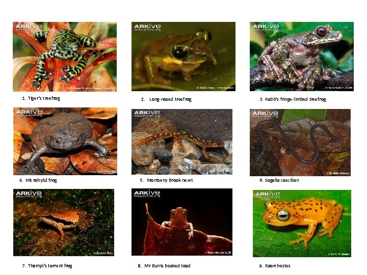 1. Tiger’s treefrog 4. Microhylid frog 7. Thampi’s torrent frog 2. Long-nosed treefrog 3. Rabb’s fringe-limbed treefrog 5. Montseny Brook newt 6. Sagalla caecilian 8. Mr Burns beaked toad 9. Raorchestes