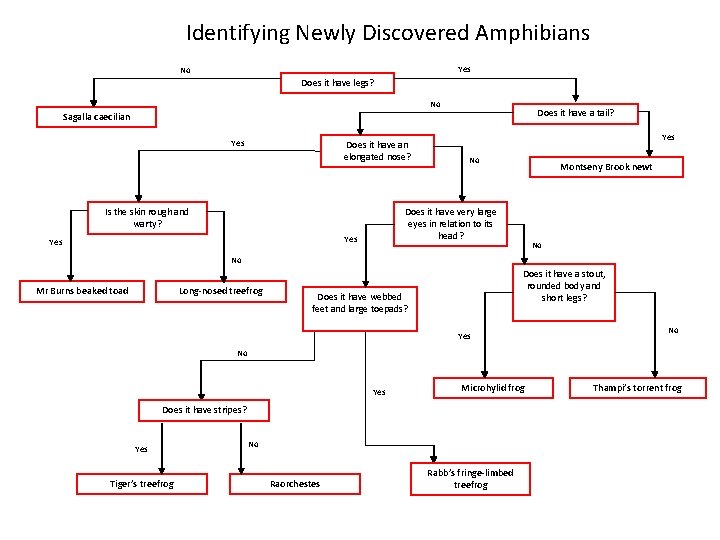Identifying Newly Discovered Amphibians Yes No Does it have legs? No Does it have a tail? Sagalla caecilian Yes Does it have an elongated nose? Is the skin rough and warty? No Montseny Brook newt Does it have very large eyes in relation to its head? Yes Yes No No Mr Burns beaked toad Long-nosed treefrog Does it have a stout, rounded body and short legs? Does it have webbed feet and large toepads? Yes No No Yes Microhylid frog Does it have stripes? Yes Tiger’s treefrog No Raorchestes Rabb’s fringe-limbed treefrog Thampi’s torrent frog