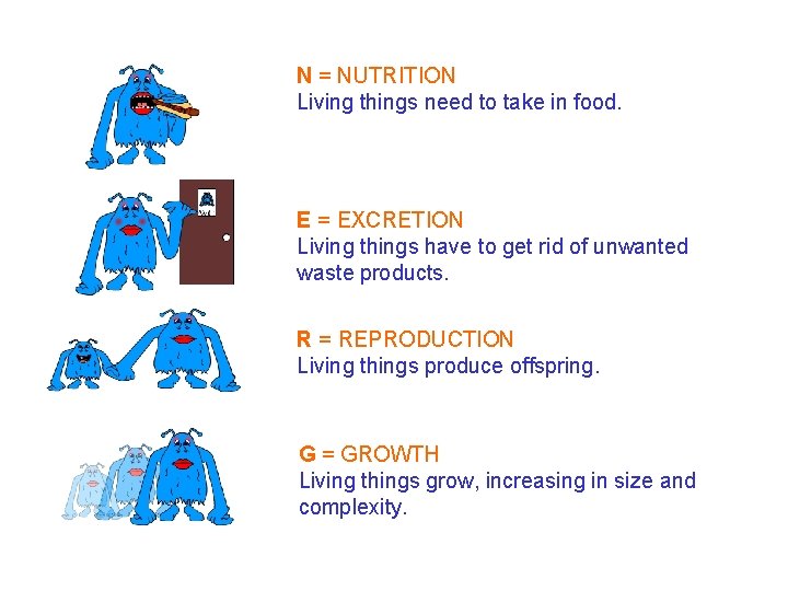 7 A Signs of life - The meaning of life N = NUTRITION Living things need to take in food. E = EXCRETION Living things have to get rid of unwanted waste products. R = REPRODUCTION Living things produce offspring. G = GROWTH Living things grow, increasing in size and complexity.