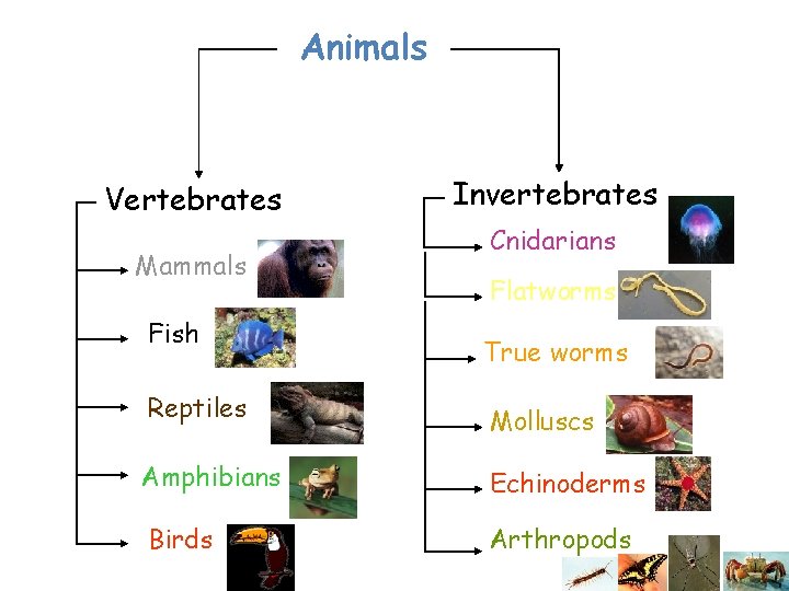 Animals Vertebrates Mammals Fish Invertebrates Cnidarians Flatworms True worms Reptiles Molluscs Amphibians Echinoderms Birds Arthropods