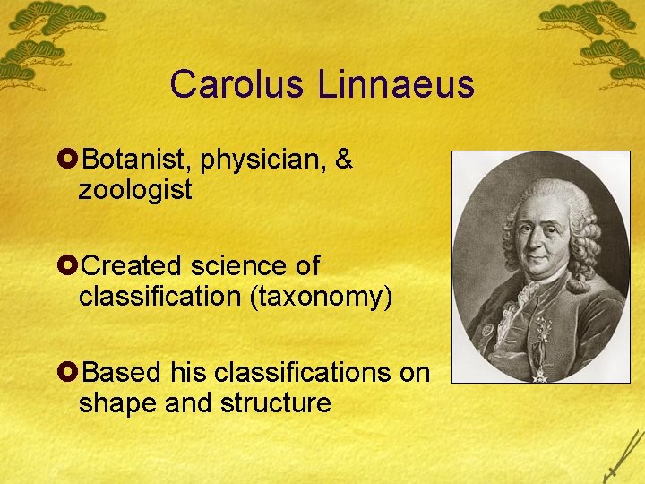 Carolus Linnaeus £Botanist, physician, & zoologist £Created science of classification (taxonomy) £Based his classifications on shape and structure