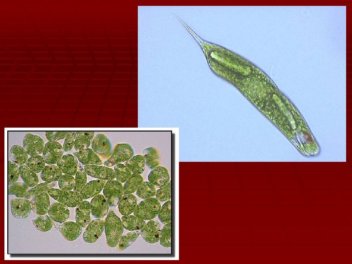 Plant and Animal like Protists The Euglena: § exhibits both animal-like and Plant-like characteristics § contains chloroplasts, which are involved in PHOTOSYNTHESIS § contains a flagellum, which is used for LOCOMOTION § euglena may be autotrophic or heterotrophic depending on the