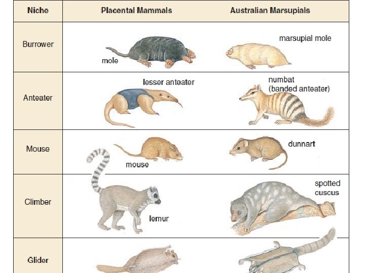 Marsupials and Placentals The division between marsupials and placentals occurred about 100 MYA They have very different reproductive strategies but there is much evidence for convergent evolution between the 2 groups Mammals that lay eggs Duck billed platypus/ Echidna