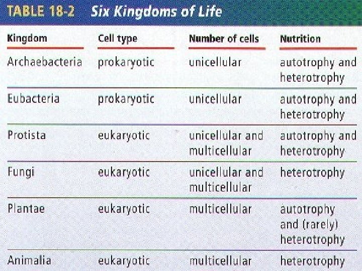 Life’s Six Kingdoms • Kingdom Eubacteria Archaebacteria Cell Types Body Form. Method of Feeding Prokaryote Unicellular Complex Organ Auto/Hetero No No Protista Eukaryote Uni/Multi Auto/Hetero No Fungi Eukaryote Multicellular Heterotrophic No Plants Eukaryote Multicellular Autotrophic Yes Animals Eukaryote Multicelllular Heterotrophic Yes Bacteria are the ONLY Prokaryotes on Earth! Archaebacteria similar to first true Autotrophs!