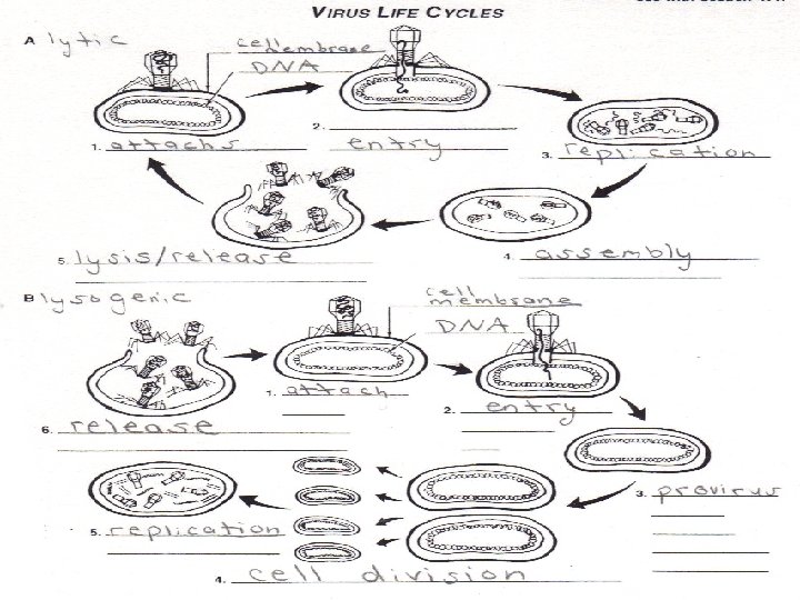 Reproduce: inside a host cell; 2 different cycles • Lytic Cycle (Attach, Entry, Replication, Assembly, Lysis/release) • Lysogenic Cycle (Attach, Entry, Provirus, Cell division, Replication, lysis/release)