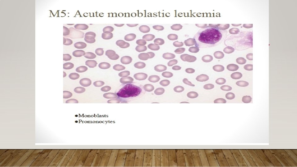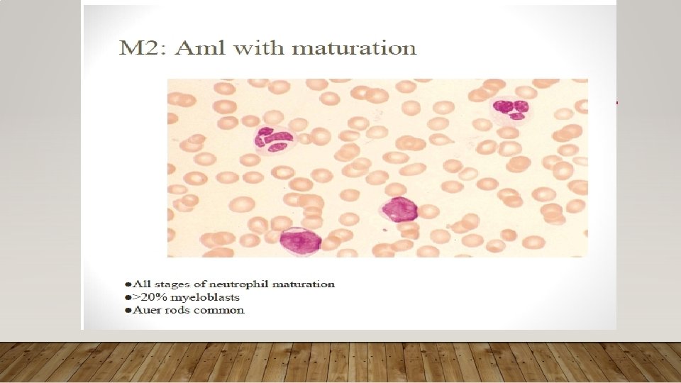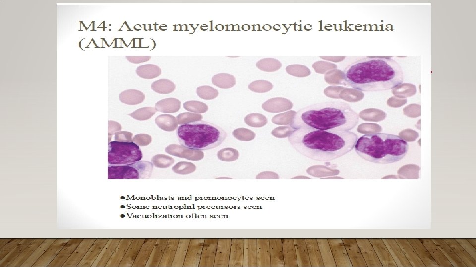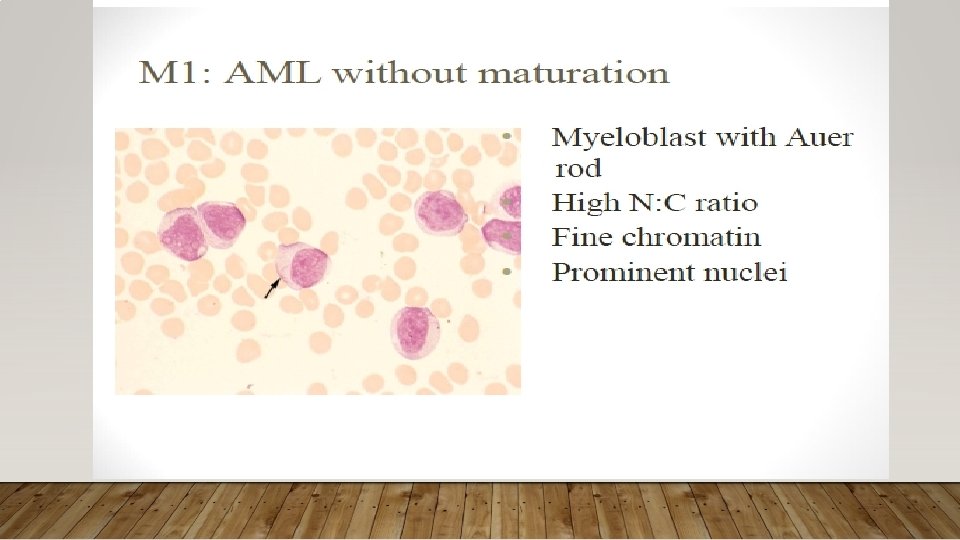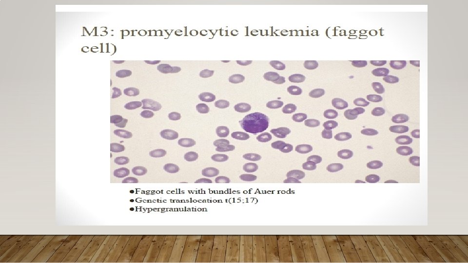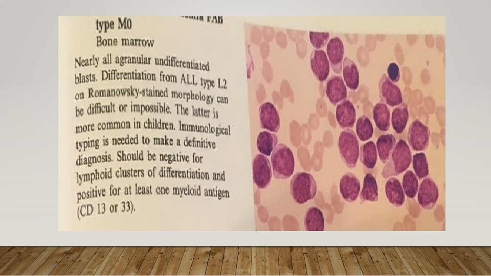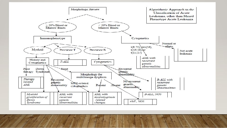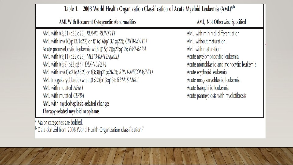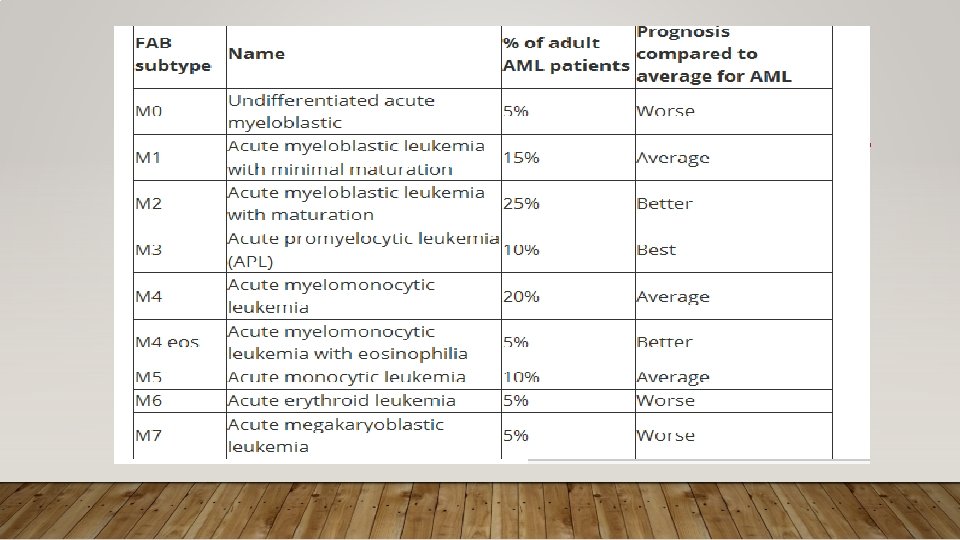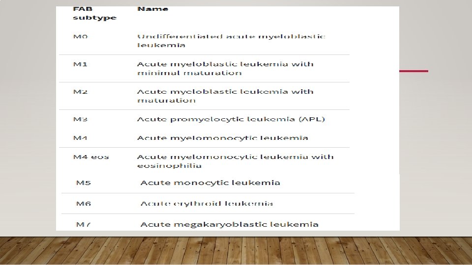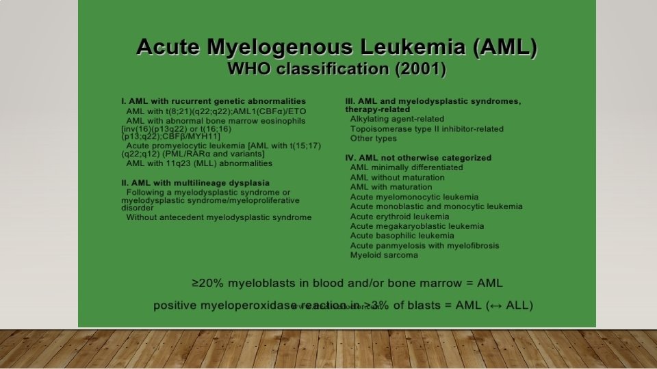 HOW IS ACUTE MYELOID LEUKEMIA CLASSIFIED? • Historically, AML was classified by the morphology and cytochemical (and later flow cytometric) phenotype of the tumor cells under the French-American-British (FAB) AML classification system. (in 1976 and later revised in 1985) • FAB system divided AML into subtypes, M 0 through M 7, based on the type of cell from which the leukemia develops and how mature the cells are. This was based largely on how the leukemia cells looked under the microscope after routine staining