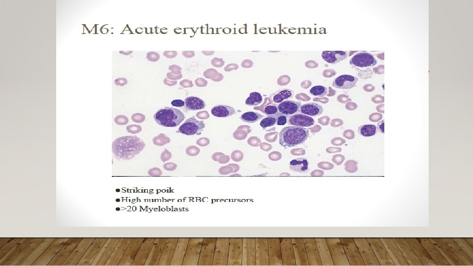 • Cases with 50% or more erythroid cells and >20% total myeloblasts usually meet criteria for AML with myelodysplasia-related changes and should be diagnosed as such; cases with>20% total myeloblasts not meeting criteria for AML with myelodysplasia-related changes or AML with recurrent genetic abnormalities should be categorized as 1 of the other subtypes of AML, NOS. • Pure erythroid leukemia remains as an AML, NOS subtype and is now the only type of acute erythroid leukemia