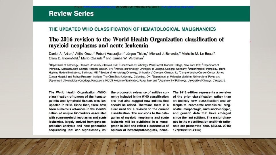 • In order to stress the significance of the PML-RARA fusion, which may be cryptic or result from complex cytogenetic rearrangements other than t(15; 17)(q 24. 1; q 21. 2), acute promyelocytic leukemia (APL) with this fusion is renamed as APLwith PMLRARA. • Finally, a new provisional category of AML with BCR-ABL 1 is added to recognize these rare de novo AML cases that may benefit from TKI therapy. • Although the diagnostic distinction between de novo AML with BCR-ABL 1 and blast transformation of CML may be difficult without adequate clinical information, the significance of detecting this targetable fusion is felt to warrant a provisional disease category. • Preliminary data suggest that deletion of antigen receptor genes (IGH, TCR), IKZF 1 and/or CDKN 2 A may support a diagnosis of de novo disease vs BP of CML.