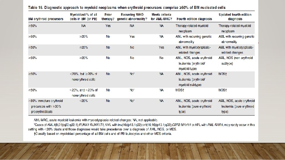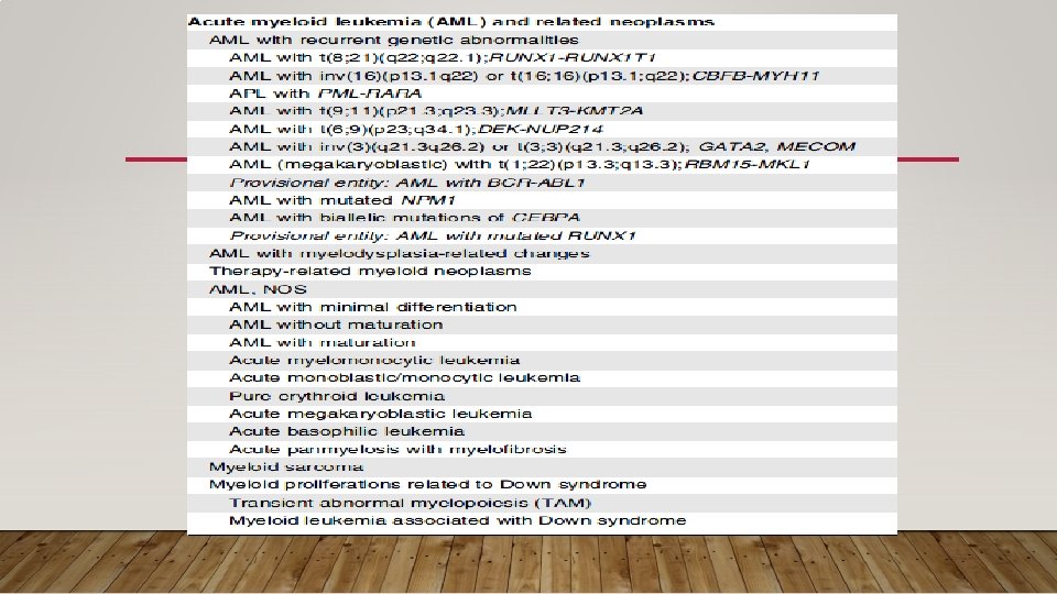 AML, NOT OTHERWISE SPECIFIED • Although the subcategories of AML, not otherwise specified (NOS) lack prognostic significance when cases are classified based on NPM 1 mutation and CEBPA biallelic mutation status, the CAC agreed to keep the AML, NOS subcategories with only a single change: • The subcategory of acute erythroid leukemia, erythroid/myeloid type(previously defined as a case with >50% BM erythroid precursors and >20% myeloblasts among nonerythroid cells) has been removed from the AML category. • In the new classification, myeloblasts are always counted as a percentage of total marrow cells and the majority of such cases have<20% total blast cells and are now classified as MDS (usually MDS with excess blasts).