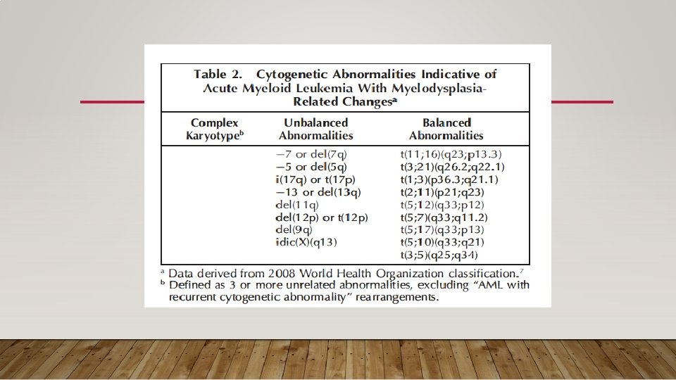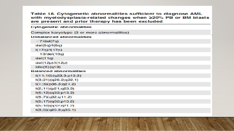 • In 2008, the WHO criteria were revised and included additional entries in the category of AML with recurrent genetic abnormalities. • One important revision was to modify "AML with abnormalities of l 1 q 23; MLL" from the previous edition and to change this to t(9; 1 l)(p 22; q 23); MLLT 3 -MLL. • This was done to reflect that all MLL rearrangements are not identical. In fact, it is recommended that variant MLL translocations also be specified in the diagnosis. • Additional chromosomal rearrangements added to the most recent WHO classification include t( 6; 9)(p 23; q 34); DEK-NUP 21, inv(3)(q 21 q 26. 2) or t(3; 3)(q 26. 2); RPN 1 -EVll, and t(1; 22)(p 13; q 13); RBM 15 -MKLl