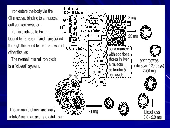 Daily Fe++ turnover continuous process RBC 2500 mg Via RE system 90% extra vascular 5 -10% intra vascular R. E. 20 mg Released daily Iron Absorption 1 -2 mg only Plasma Fe Transferrin carriers 4 mg 20 mg Fe Returned to immature RBC in BM Loss (from GI tract) 1 -2 mg daily Body stores 1000 mg (M) 300 -500 mg (F) Myglobin 300 mg