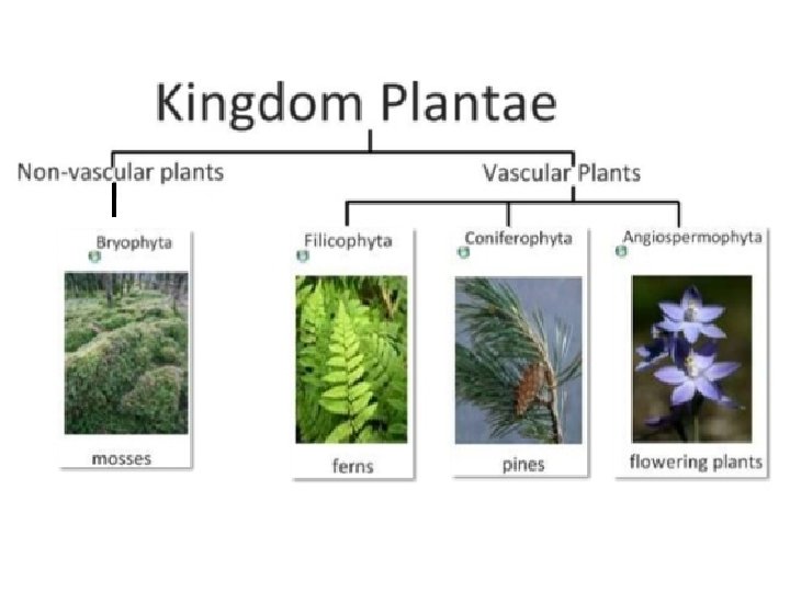 5. 3. 10 External recognition features of bryophytes, filicinophytes, coniferophytes, and angiospermophytes. See page 266 of text KINGDOM PLANTAE • The different types of plants are put into phylum. Most plants are in one of four phyla, but there are other smaller phyla. 1. Bryophyta: mosses, liverworts, hornworts 2. Filicinophyta: ferns 3. Coniferophyta: conifers 4. Angiospermophyta: flowering plants