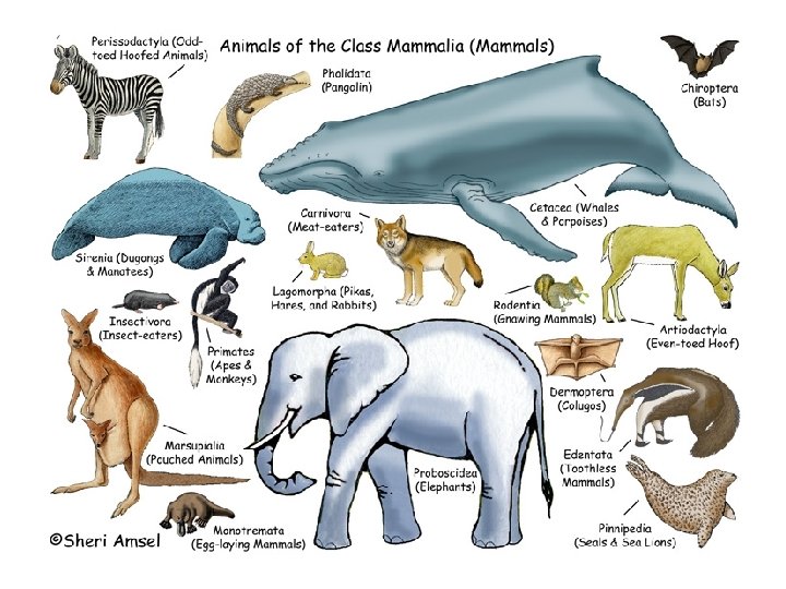 MAMMALS • Skins with follicles with hair made of keratin • Lungs with alveoli, ventilated used ribs and diaphragm • Most give birth to live young and all feed young with milk rom mammary glands • Maintain constant body temperature