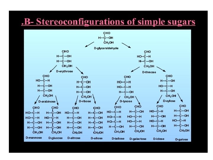 B- Stereoconfigurations of simple sugars. Carbohydrates contain many stereocenters. 1 - If the OH group is found on the right side of the carbon chain, the sugar is designated as a D sugar. 2 -If the OH group is found on the left side of the chain of carbons, the sugar is designated as an L sugar