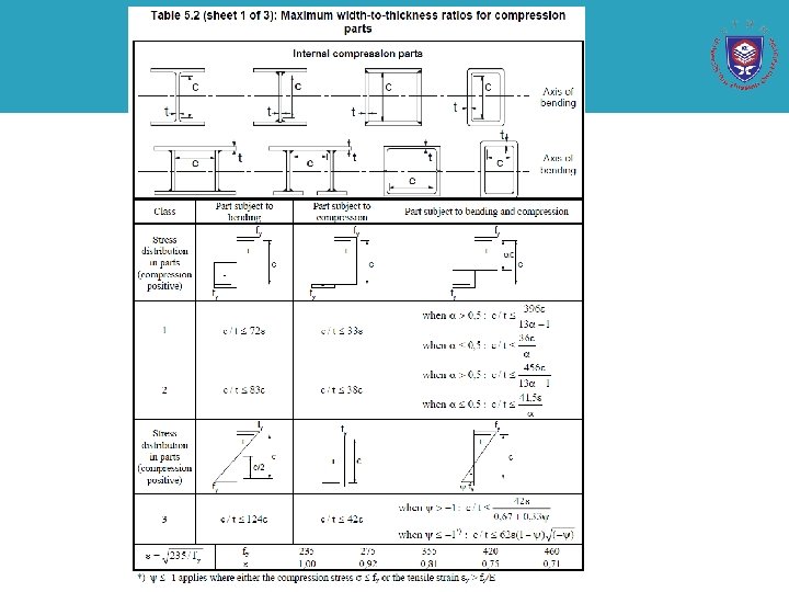 Classification under combined bending and axial force • Should be classified based on the actual stress distribution of the combined loadings – For simplicity , initial check carried out under the severe loading condition of pure axial compression. • If the section classified as Class 1 or 2, nothing to be gained by conducting additional calculations with the actual pattern of stress • If the classification is Class 3 or 4, it is advisable for economy to conduct a more precise classification under combined loading