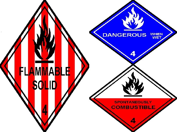 • 4. 1 : - Flammable solids [solids other than those classified as explosive, which are readily combustible or may cause fire through friction] • 4. 2: - Solids liable for spontaneous combustion. • 4. 3: - Solids which in contact with water emit flammable gases.