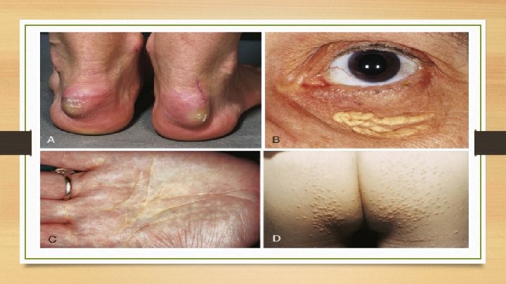 Type II 1. Type IIa: increase in serum CH (>260 mg/d. L) and LDL (>190 mg/d. L). Serum TG <300 mg/d. L. 2. Type IIb: increase in serum CH (>260 mg/d. L) and LDL (>190 mg/d. L). Serum TG >300 mg/d. L. 3. Acquired causes of type II hyperlipoproteinemia 1. Primary hypothyroidism: decreased synthesis of LDL receptors 2. Blockage of bile flow: bile contains CH 3. Nephrotic syndrome: increased liver synthesis of CH 4. Genetic causes of type II hyperlipoproteinemia 1. Polygenic hypercholesterolemia (type IIa): most common type (85% of cases). Multifactorial (polygenic) inheritance. Alteration in regulation of LDL levels with primary increase in serum LDL and TG <300 mg/d. L. 2. Familial combined hypercholesterolemia (type IIb): AD inheritance. CH and TG begin to increase around puberty. Associated with metabolic syndrome. Increase in CH and TG >300 mg/d. L. Decrease in HDL. 3. Familial hypercholesterolemia (type IIa): AD inheritance. Deficiency of LDL receptors. Achilles tendon xanthoma, xanthelasma (yellow plaques on eyelid. Premature CAD and stroke. Increase in serum CH and LDL. Serum TG <300 mg/d. L. Decrease in HDL.