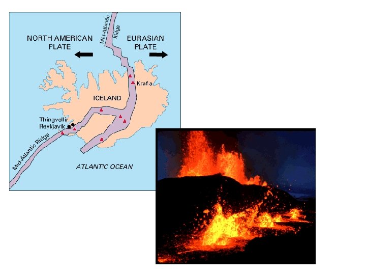 At intra plate locations (away from plate boundaries) the lithosphere is moving slowly (2 -10 cm/year) over the top of a mantle plume. A mantle plume is an area of extra high heat flow (up to 300°C) rising up through the mantle. It is NOT magma, but hot rocks which rise as they are less dense than the surrounding rocks. As the plume nears the surface it is under less pressure and partially melts due to decompression melting. The solid peridotite partially melts to form basaltic magma which erupts at the surface in an effusive manner.