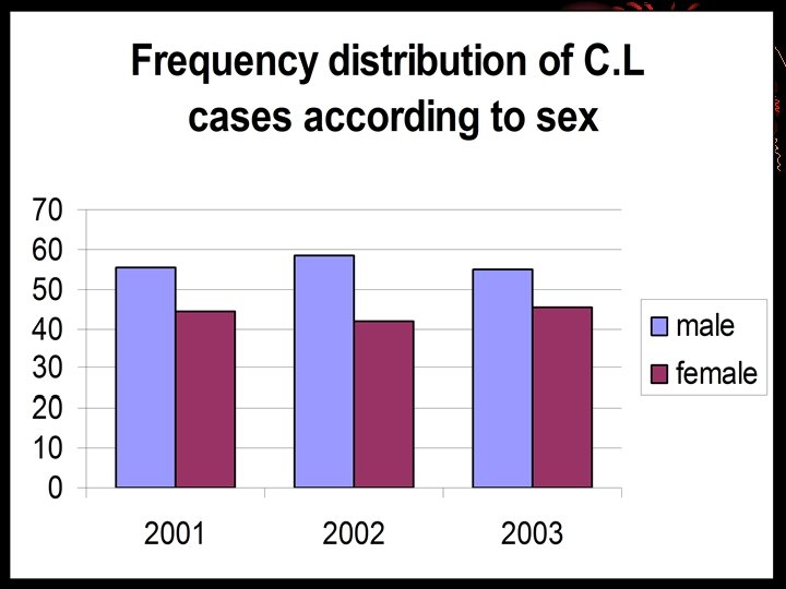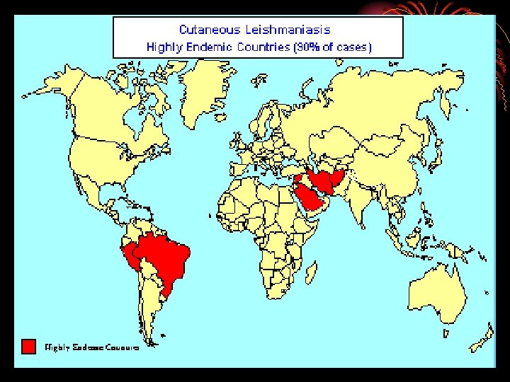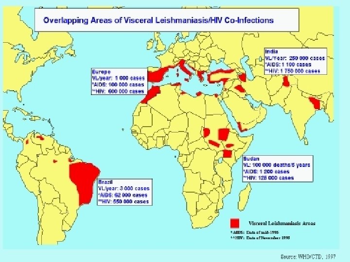 Distribution of Leishmaniaiasis in the world 72 are developing countries -Endemic in 88 countries 13 are among the least developed countries -Population at risk: 350 millions 1 -1. 5 millions cases of C. L -Annual incidence: estimated at 500, 000 cases of V. L. -Overall prevalence: 12 millions people - More than 90% of C. L. cases occur in; Iran, Algeria Afghanistan, , Brazil, Peru, Saudi Arabia and Syria More than 90% of V. L. Cases occur in 5 countries ; Bangladesh, India , Nepal, Sudan, and Brazil 1, 410, 000 male -The DALY burden is 2, 357, 000 946, 000 female -Annual death due to V. L. is 24, 000 female 59, 000 cases 35, 000 male *DALYS-Disability Adjusted Life Years (due to premature death and disability)