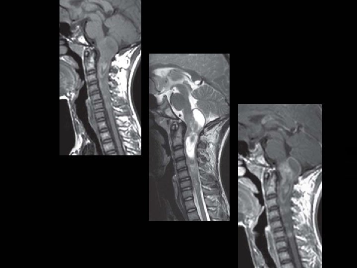 � They are solid tumors without necrosis. � Marked T 2 hyperintensity and enhance following gadolinium administration. � There is no associated syringomyelia. � Clinically, these patients initially respond to steroid treatment for a short time but usually recur after treatment.