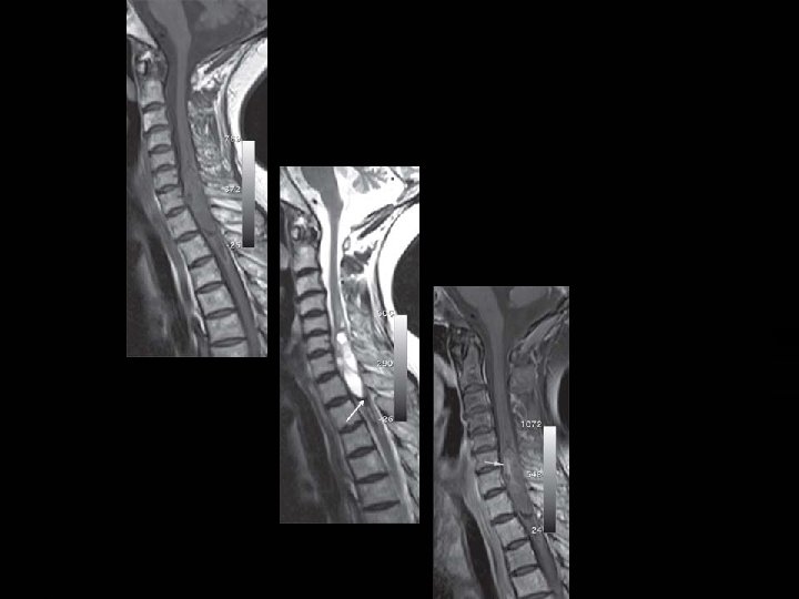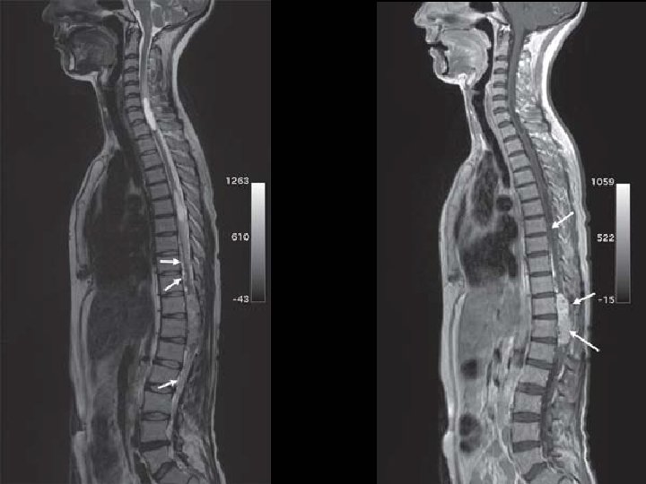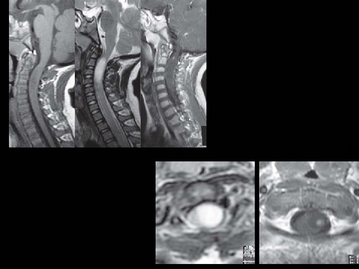 Intramedullary Metastases � Intramedullary spinal cord metastases are rare but, with increasing use of MR imaging are being encountered with increasing frequency. � These represent approximately 2 percent of all metastases to the central nervous system; these usually involve the cervical cord. � The most common primary tumors that metastasize to the spinal cord include lung, breast, colon, lymphoma and kidney; rarely, intramedullary spinal cord metastasis may be the initial presentation of the malignancy.