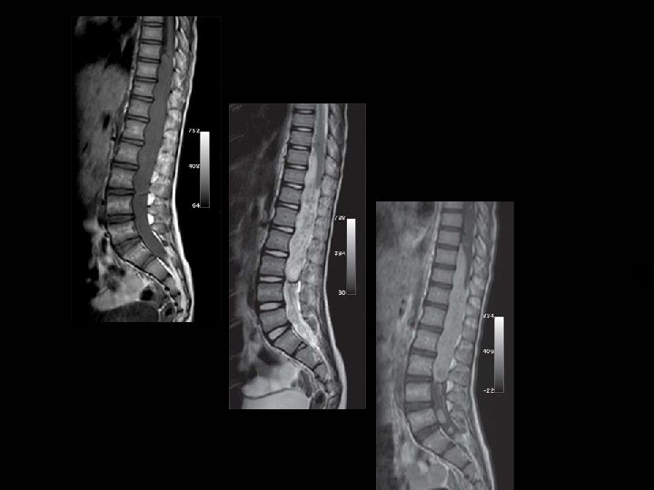 Paraganglioma � Although spinal paragangliomas are rare, they are third most common primary tumor to arise in the filum terminale (after ependymoma and astrocytoma). � MR imaging studies of these lesions typically reveal a well-circumscribed mass that is isointense relative to the spinal cord on T 1 WI and iso- to hyperintense on T 2 WI