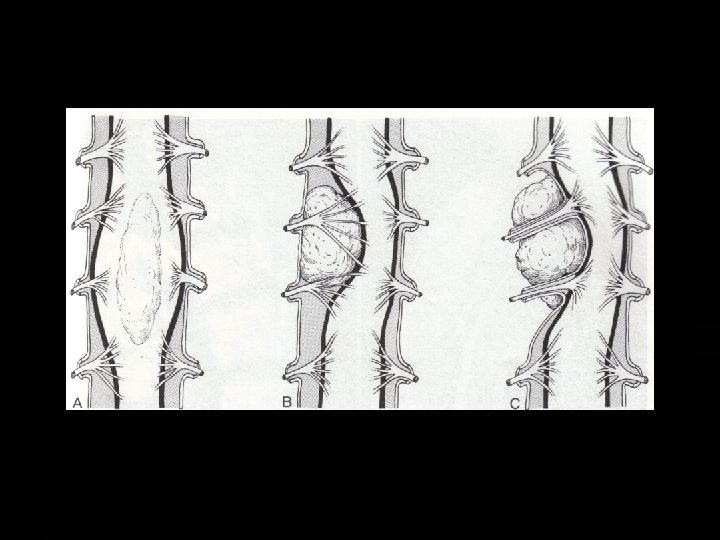 � � � Solid components are usually in septations and are composed of fibrous tissue, reactive bone and giant cells. In 5 -7. 5 percent of cases, the solid component predominates histologically. Radiographs of spinal ABCs generally show marked expansile remodeling of bone centered in the posterior elements, although extension into the vertebral body is frequently seen. A thin, outer periosteal rim and septations may be apparent. Spinal ABC, similar to GCT and chordoma, may extend into adjacent vertebral bodies, intervertebral disks, posterior ribs and paravertebral soft tissues.