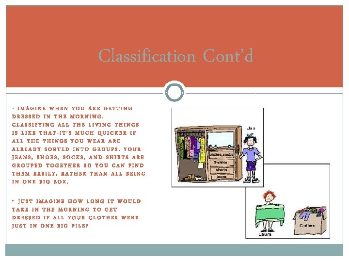 Classification Cont’d IMAGINE WHEN YOU ARE GETTING DRESSED IN THE MORNING. CLASSIFYING ALL THE LIVING THINGS IS LIKE THAT-IT’S MUCH QUICKER IF ALL THE THINGS YOU WEAR ARE ALREADY SORTED INTO GROUPS. YOUR JEANS, SHOES, SOCKS, AND SHIRTS ARE GROUPED TOGETHER SO YOU CAN FIND THEM EASILY, RATHER THAN ALL BEING IN ONE BIG BOX. • • JUST IMAGINE HOW LONG IT WOULD TAKE IN THE MORNING TO GET DRESSED IF ALL YOUR CLOTHES WERE JUST IN ONE BIG PILE?