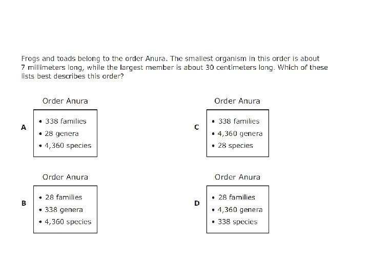 K P C O F G S System of Classification • Taxonomic categories, an acronym: – Domain – Kingdom – Phylum – Class – Order – Family – Genus – Species Dear King Phillip Came Over For Good Soup
