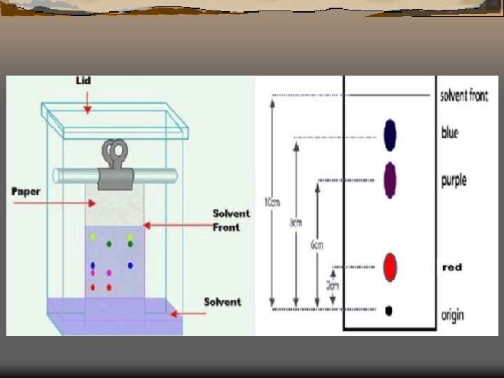 Paper Chromatography Ü It is important that the solvent start below the marked mixture. Ü It is also important that you mark the solvent front (the highest point reached by the solvent). Ü An Rf value or retention factor, can be calculated as such: Ü Rf= distance traveled by compound (cm) distance traveled by the solvent (cm)