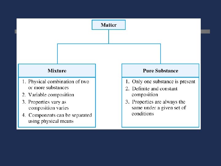 A. Matter Flowchart MATTER yes MIXTURE yes Is the composition uniform? Homogeneous Mixture (solution) PURE SUBSTANCE no Heterogeneous Mixture Colloids no Can it be physically separated? yes Can it be chemically decomposed? Compound Suspensions no Element